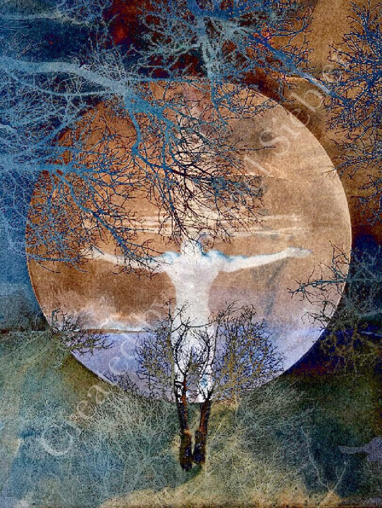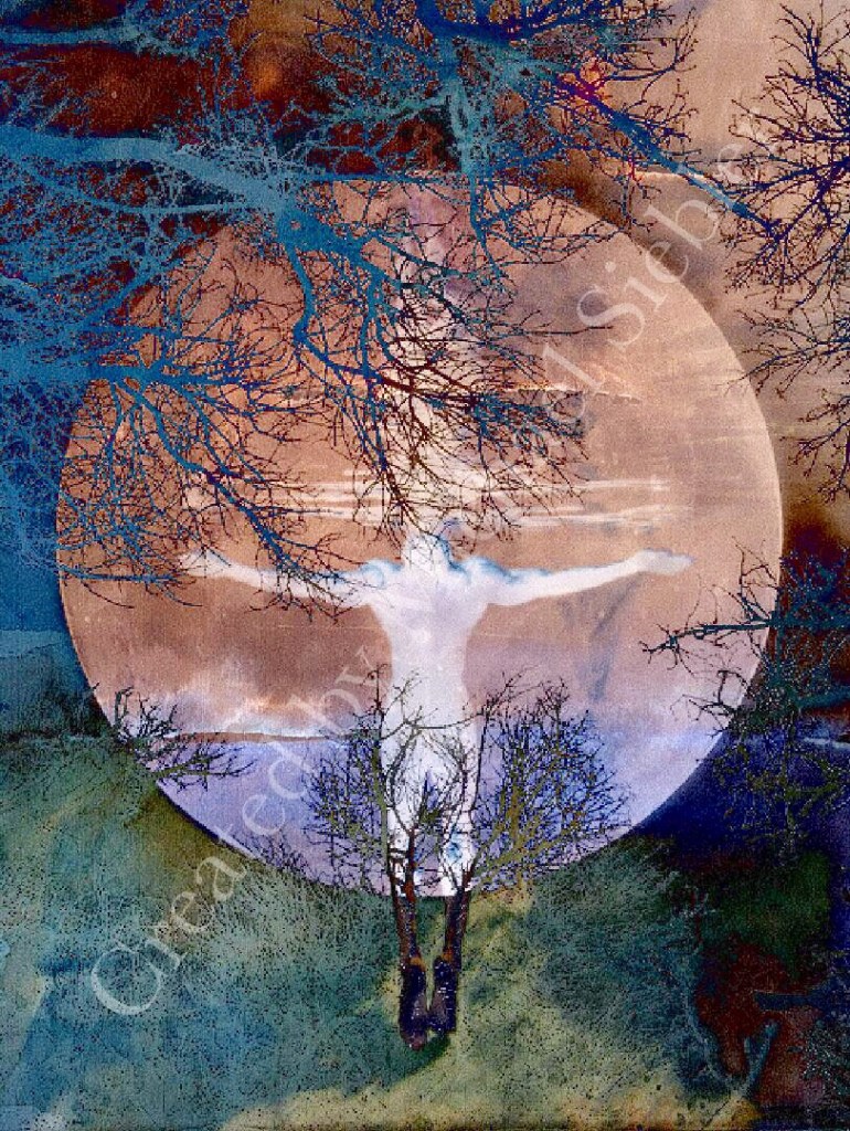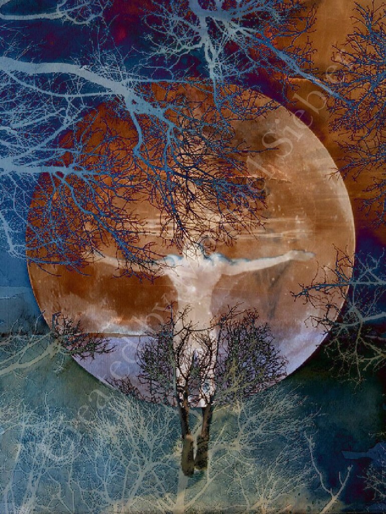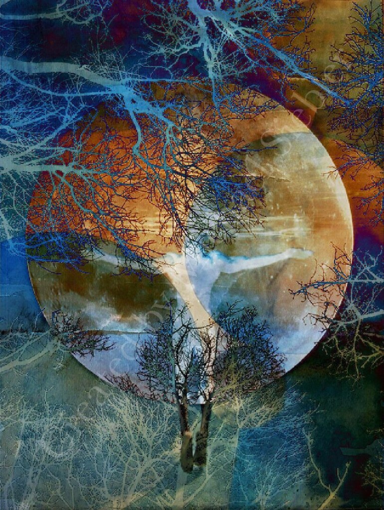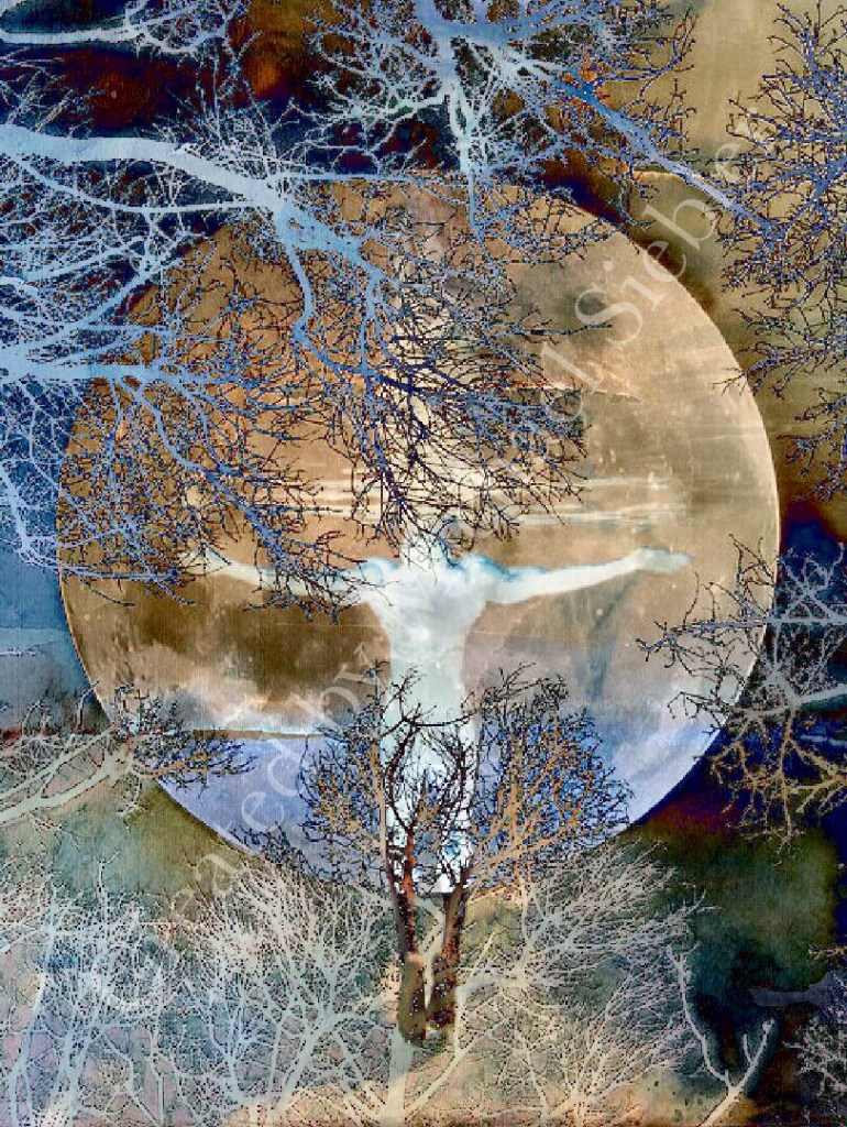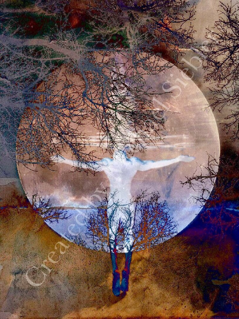 Das Bild hat eine meditative, fast magische Wirkung. Durch die Komposition zweier Fotos und einem meiner Aquarelle. Das liegt sicher an dem riesigen Mond vor dem der Mensch schwerelos zu schweben scheint.